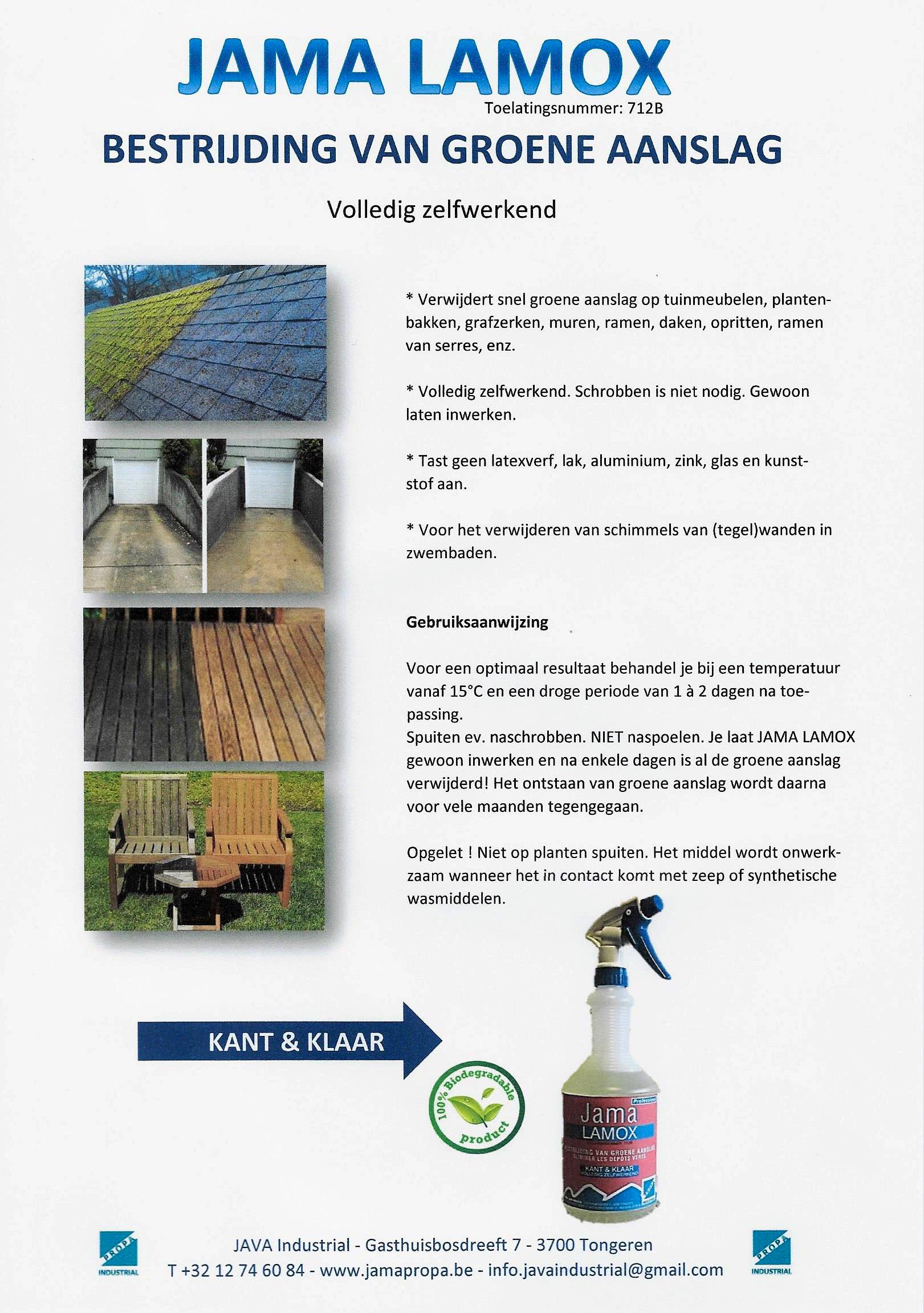 Reinigingsmiddel voor daken. Wordt gebruikt voor het verwijderen van groene aanslag op tegelpaden, grafzerken, muren, daken, opritten enz. pH: 2.6